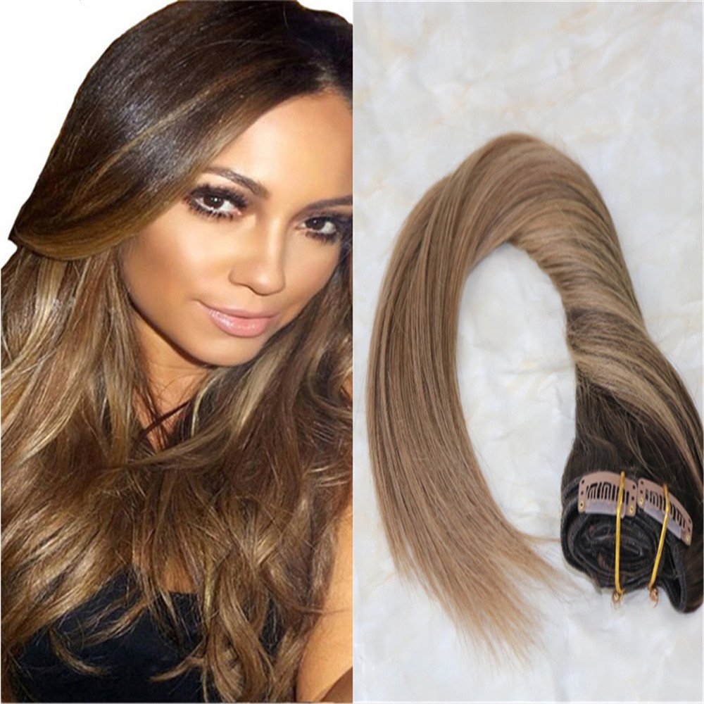 Amazon Com Hairdancing 22 7pcs 120g Balayage Ombre Color 4 Dark Brown Fading To Color 18 Ombre Clip In Hair Extensions Human Hair Full Head Clip On Extensions Balayage Remy Extensions Beauty