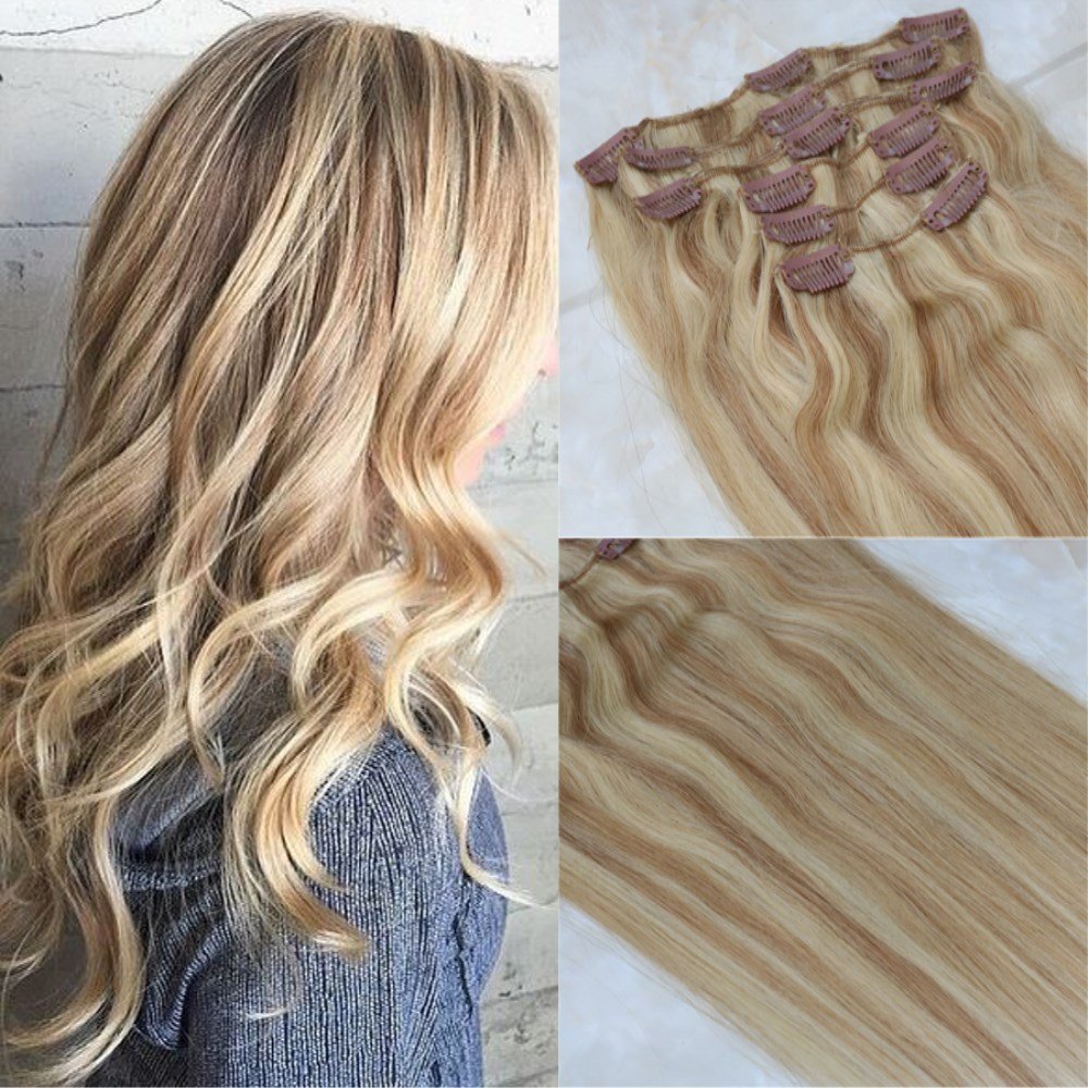 Amazon Com Hairdancing 16 7pcs 120g Full Head Set Clip In Highlight Extensions Remy Human Hair Brown 18 Ash Blonde With Color 613 Bleach Blonde Hair Extensions Clip In Extensions Beauty